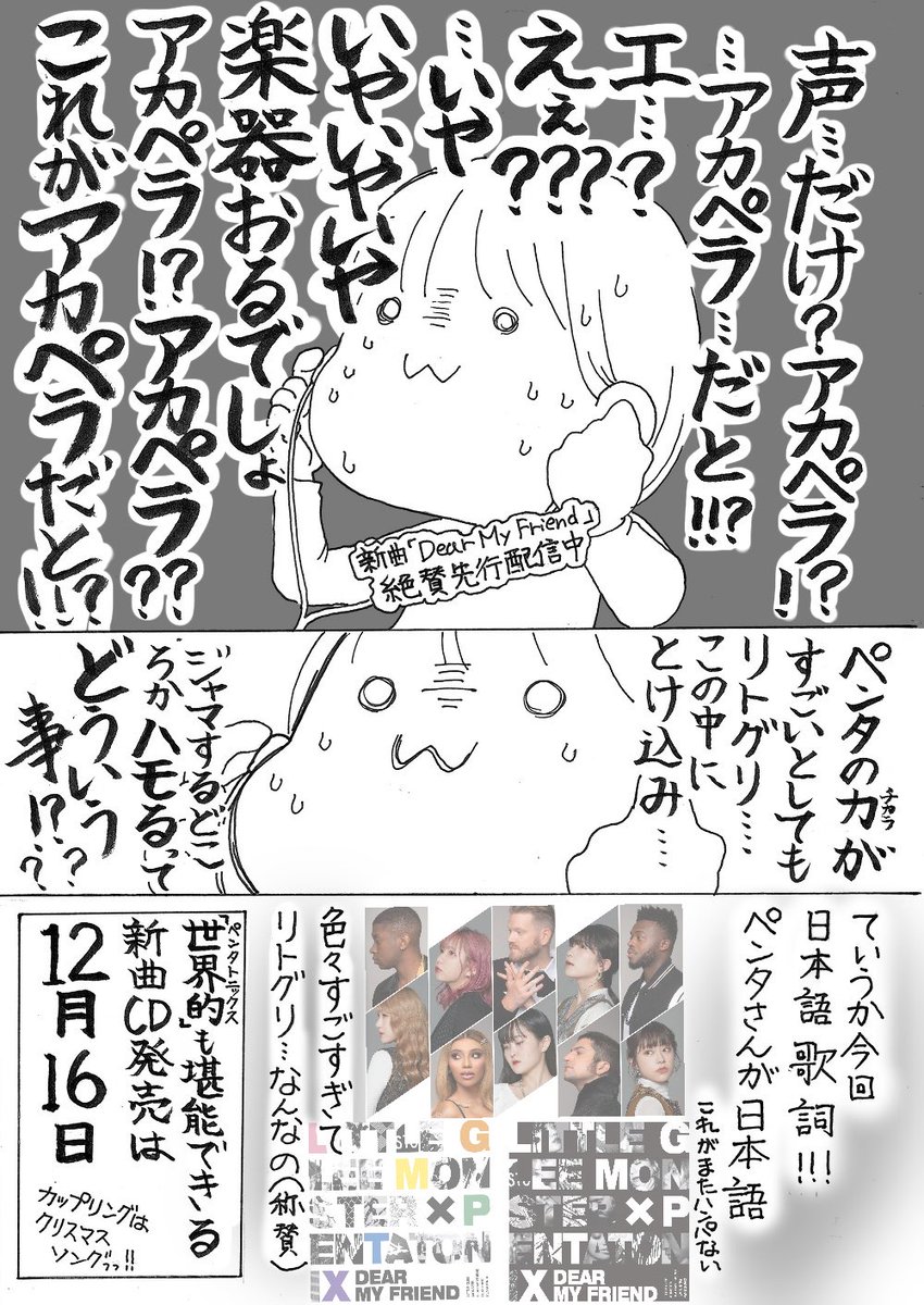 ====全米1位獲得の世界的アカペラグループ「ペンタトニックス」と夢のコラボが実現!作詞・作曲に亀田誠治氏を迎え制作され、閉塞感のある現在の情勢にもそっと寄り添えるような「友のことを想う気持ち」が込められたlittle glee monster17枚目のシングル「「dear my friend feat. Lyrics for dear my friend by little glee monster feat. Pentatonix tries to sing 100 pop songs in 10 minutes challenge. Da yo dear my friend ima mo dokoka de dareka no inochi ga futo owatte hajimari ga atte kanashimi no mukou ni wa motto yasashii mirai ga matteiru kana aozora ga ureshikute kimi ni aitaku natta yo dear my friend moshimo negai kanau nara pentatonix is the 1st track from the dear my friend feat. color coded lyrics little glee monster feat. Oh, dear my friend, la la la. Pentatonix is the 17th single by little glee monster. Little glee monster ain t no mountain high enough.